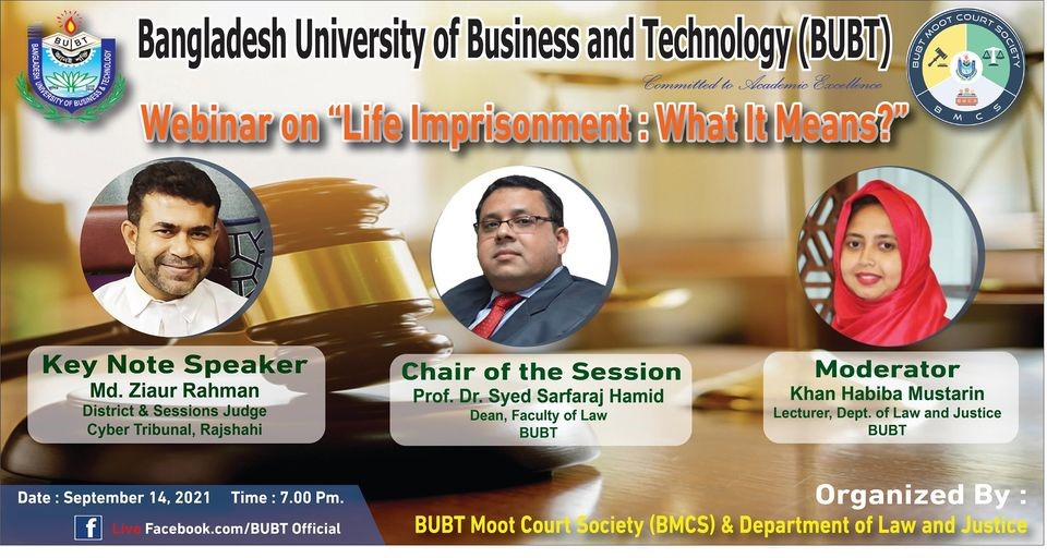 Department of Law and Justice has arranged a webinar on “Life imprisonment : what it means?” on 14 September 2021 at 7.00 pm " via an online platform (zoom). The programme was chaired by Prof. Dr. Syed Sarfaraf Hamid, Dean, Faculty of Law and Chairman Department of Law and Justice. Md. Ziaur Rahman, District and Sessions Judge, Cyber Tribunal, Rajshahi was the keynote speaker of the program.