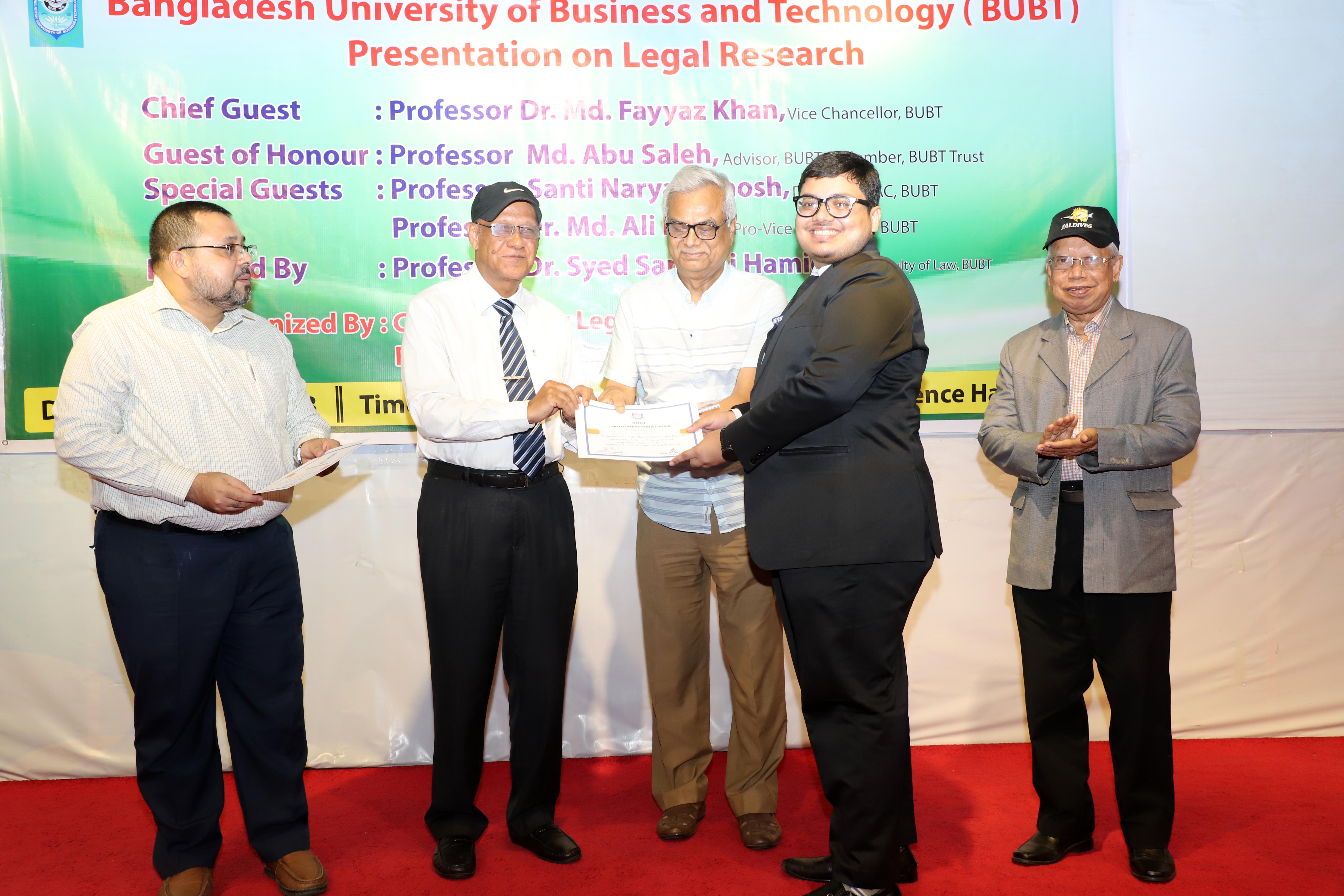 The “Center for Legal Research (CLR)” of the Department of Law and Justice, BUBT organized a session entitled “Presentation on Legal Research” on 13th June 2023 at 02.30 pm in the International Conference Hall, BUBT. Prof. Dr. Md. Fayyaz Khan, Vice Chancellor, BUBT has graced the occasion as the Chief Guest and Prof. Md. Abu Saleh, Adviser, BUBT and Member BUBT Trust has presented as the Guest of Honour. Prof. Dr. Santi Narayan Ghosh, Director, IQAC, BUBT, and Prof. Dr. Md. Ali Noor, Pro-Vice Chancellor, BUBT were the special Guests of this program. Prof. Dr. Syed Sarfaraj Hamid, Dean, Faculty of Law, and Chairman, Department of Law and Justice BUBT presided over the session. A total of six groups of students from different intakes of the Department of Law and Justice presented their research presentation highlighting different burning issues of the present time. A panel of three adjudicators critically evaluated their research presentation. Overall this was a wonderful arrangement to offer a great platform for the beginner researcher to present their presentation.